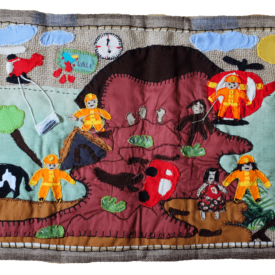 Nesta peça, estão retratados momentos vividos pela comunidade durante o crime social e ambiental ocorrido. Entre as 272 vítimas, 131 pessoas compunham o quadro de empregados diretos da mineradora Vale S.A., 119 prestavam serviços por intermédio de 31 empresas terceirizadas, outras 20 pessoas moravam ou estavam na comunidade, além de dois nascituros. A peça retrata a busca dos bombeiros pelos corpos, via helicópteros, em meio ao rejeito onde haviam também animais e veículos submersos. A logomarca da Vale é representada com gotas de sangue mostrando a responsabilidade da empresa no fato. Um relógio junto à barragem rompendo alerta para a falta de segurança, mostrando que as barragens brasileiras funcionam como “bombas-relógio”. O bolso da arpillera, que fica no verso, foi produzido com o tecido de um uniforme de um trabalhador da Vale. Apesar da gigantesca proporção do rompimento da barragem de Mariana, a Vale S.A. manteve seu posto de maior mineradora do Brasil e terceira do mundo. Em pouco mais de três anos, entre os episódios de Mariana e Brumadinho, o valor de mercado da empresa mais que triplicou: passou de R$81,25 bilhões para R$289,77 bilhões.