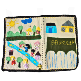 Esta Arpillera foi produzida pelas mulheres de Novo Machado, no Rio Grande do Sul, e retrata a ameaça representada pelos projetos de construção das barragens de Garabi e Panambi. A peça destaca o rio Uruguai, que divide Brasil e Argentina, evidenciando sua importância para a comunidade ribeirinha e sua relação com a natureza. O trabalho denuncia a falta de acesso a informações sobre os impactos do empreendimento e os problemas de saúde já enfrentados pela população em decorrência da tensão gerada pelo projeto. Além disso, alerta para as consequências que a construção das barragens poderá causar, como a destruição das comunidades locais, da fauna e do rio, bem como a sobrecarga dos serviços de saúde.