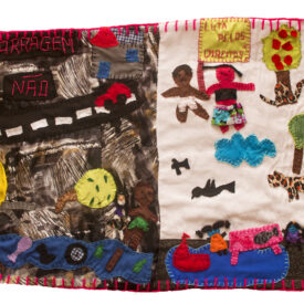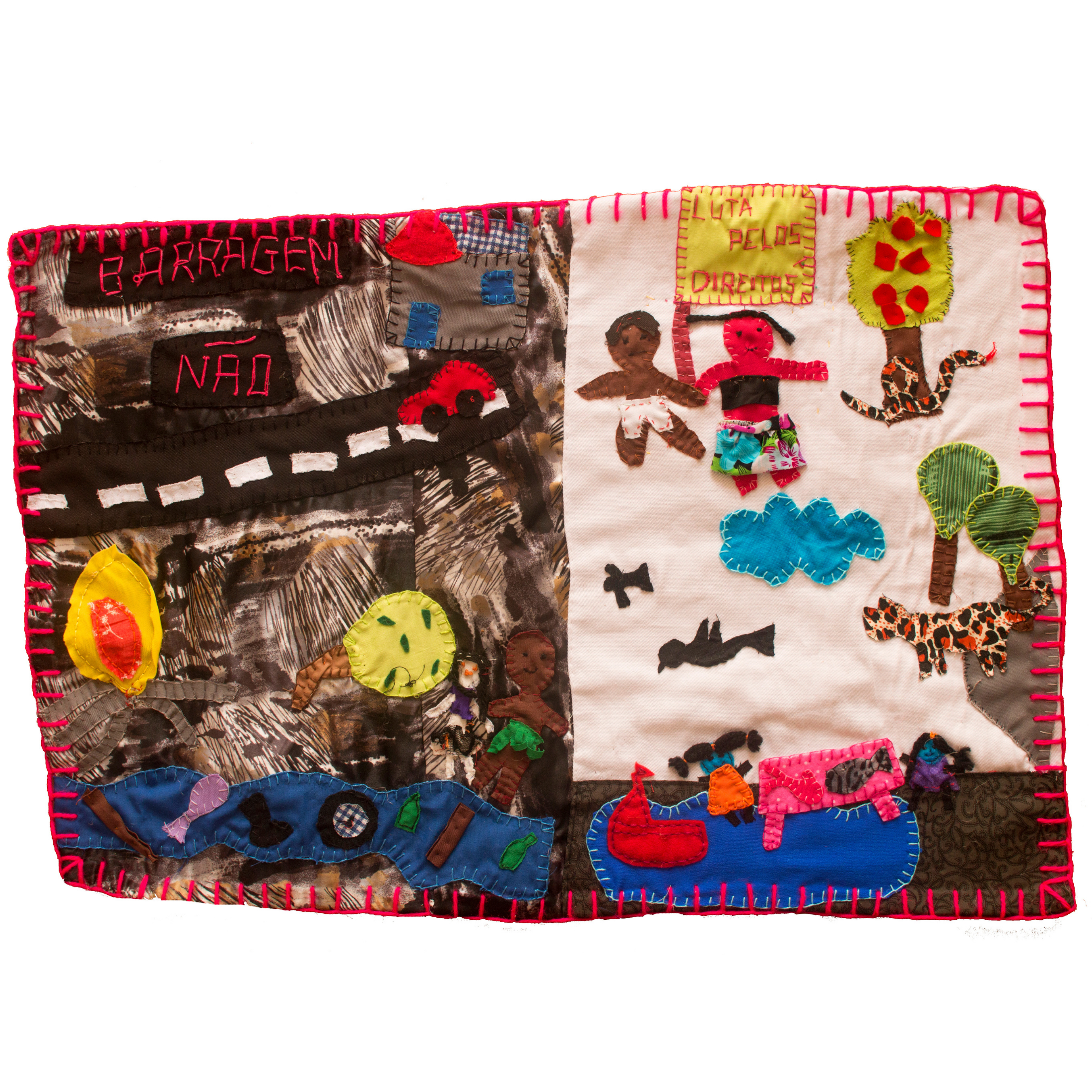 A Convenção 169 da Organização Internacional do Trabalho (OIT), da qual o Brasil é signatário, estabelece o direito dos povos indígenas à consulta e consentimento livre, prévio e informado sobre qualquer empreendimento que possa vir a ter consequências sobre seus territórios e meios de vida. No caso da UHE São Luiz do Tapajós, para o povo Munduruku, este direito está sendo sistematicamente violado. Confeccionada por mulheres da etnia Munduruku, determinadas a continuar firmes na luta pelos seus direitos, esta arpillera “mostra a nossa indignação sobre a barragem e a destruição da nossa floresta e rios, e principalmente nossa cultura indígena que será ameaçada (...) e é por isso que o povo Munduruku (mulheres) estamos em luta contra a barragem”.