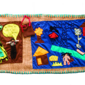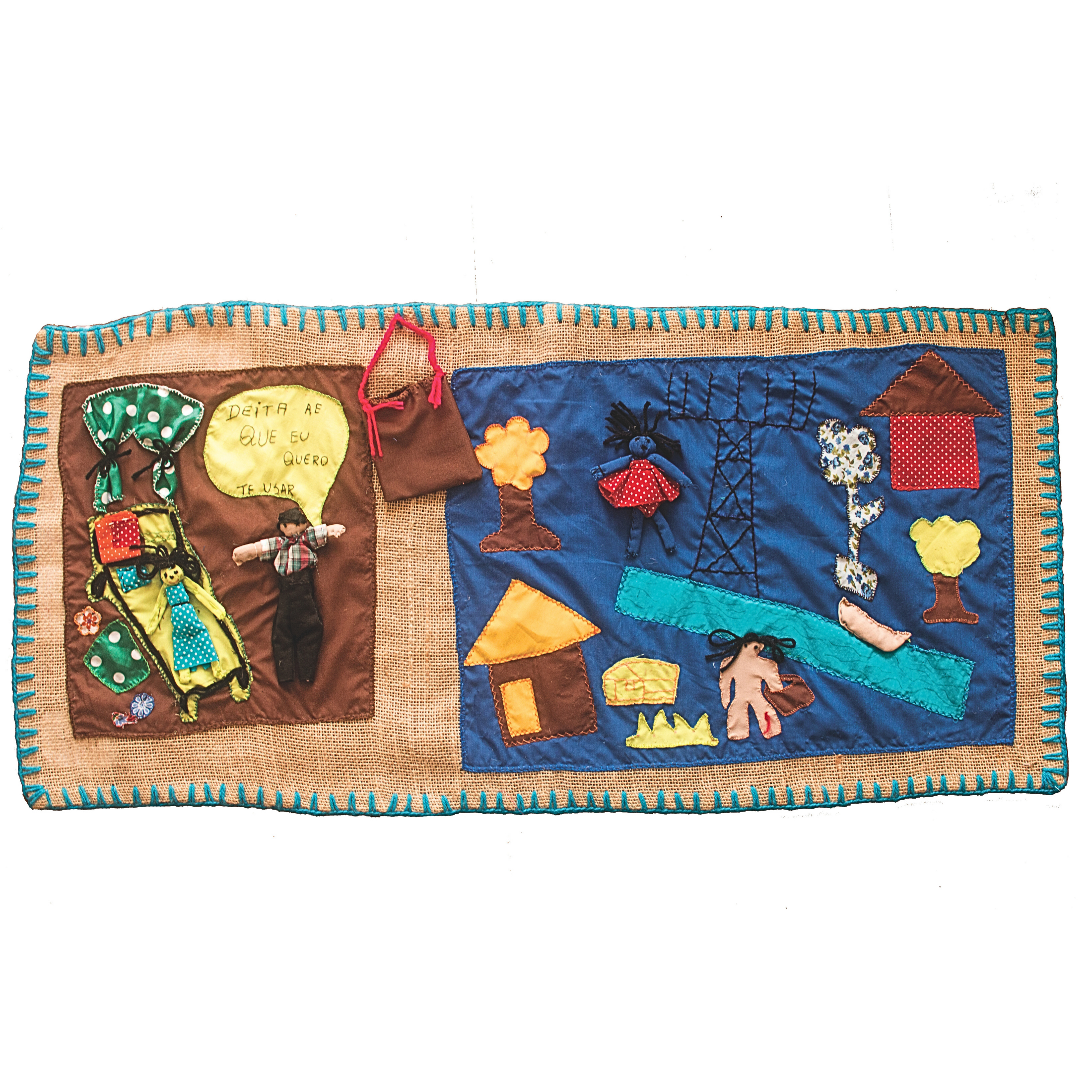 Nós trabalhamos nessa arpillera no sentido de denunciar a violação dos direitos com a mulher atingida por barragem. Aqui mostramos como que as mulheres sofrem quando não querem fazer sexo, sendo forçadas, e enchem as mulheres de filhos para ficarem em casa e eles ganham o mundo livre."