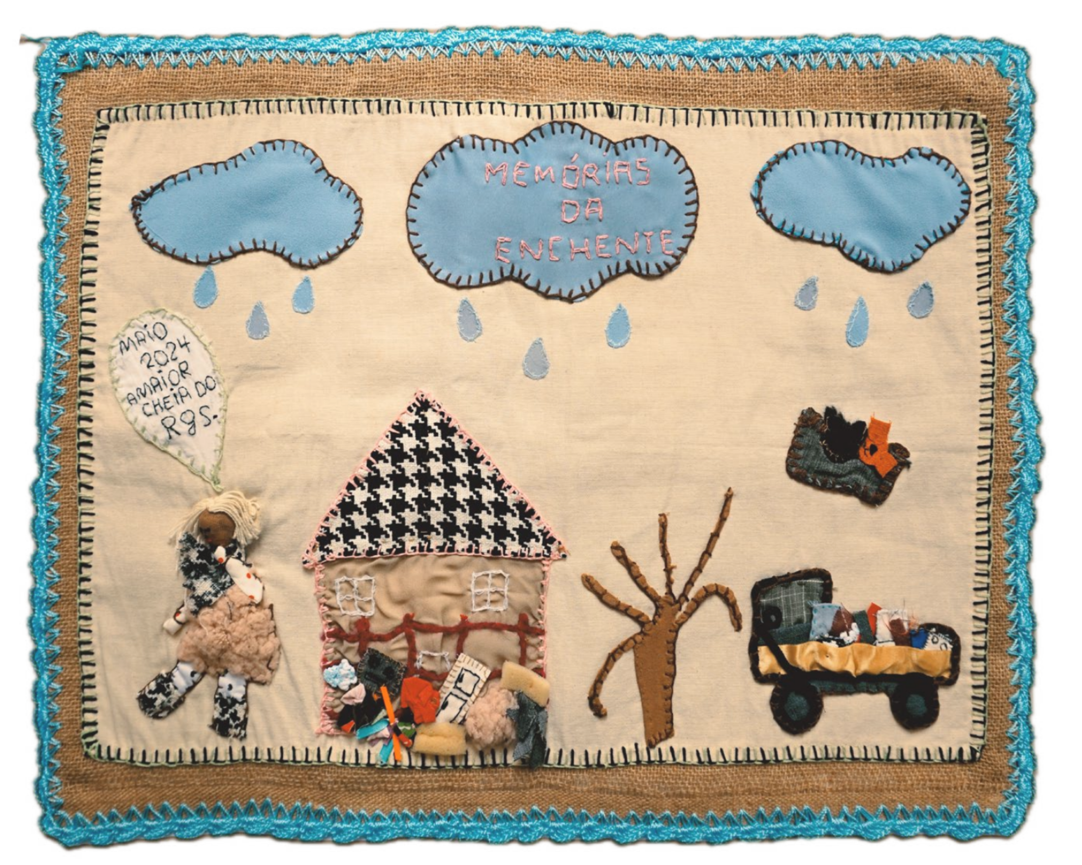 A arpillera retrata a forma como encontramos nossas casas após as enchentes que devastaram o Rio Grande do Sul em 2024. Após 34 dias embaixo d’água, tudo o que tínhamos havia virado lixo e foi levado embora em caminhões. Durante semanas de limpeza da casa, oscilávamos entre o alívio cômico, a exaustão, o nojo e o pesar. O nojo era além do visual, tinha textura, som e cheiro. O cheiro sem dúvida era o pior deles.