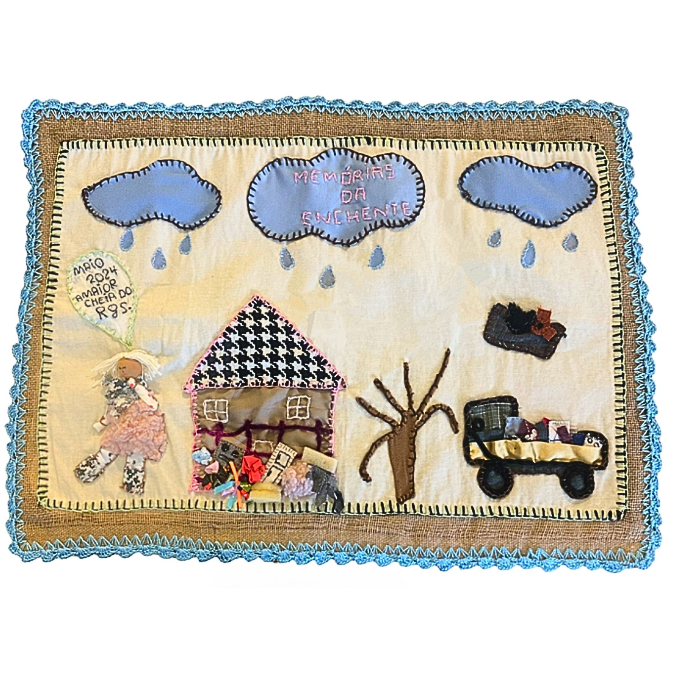 A arpillera foi produzida pelas mulheres na Comunidade do Sarandi, município de Porto Alegre/RS Brasil, atingidas pela enchente de maio de 2024 e pelo rompimento do dique do Sarandi. Esse dique que circunda o bairro faz parte do sistema de proteção de enchentes da cidade, mas não funcionou por ter sido negligenciado e sem a devida manutenção, causando inundação nas casas, com perda total de móveis e eletrodomésticos e estrutura das casas, que até hoje necessitam de reparos, além de seus meios de trabalho, danos materiais e vidas. Até hoje lutamos por moradia, infraestruturas básicas de saúde e escolas que não foram reconstruídas, além de alimentos que ainda se fazem muito necessários, por se tratar de comunidade atingida de baixa renda.