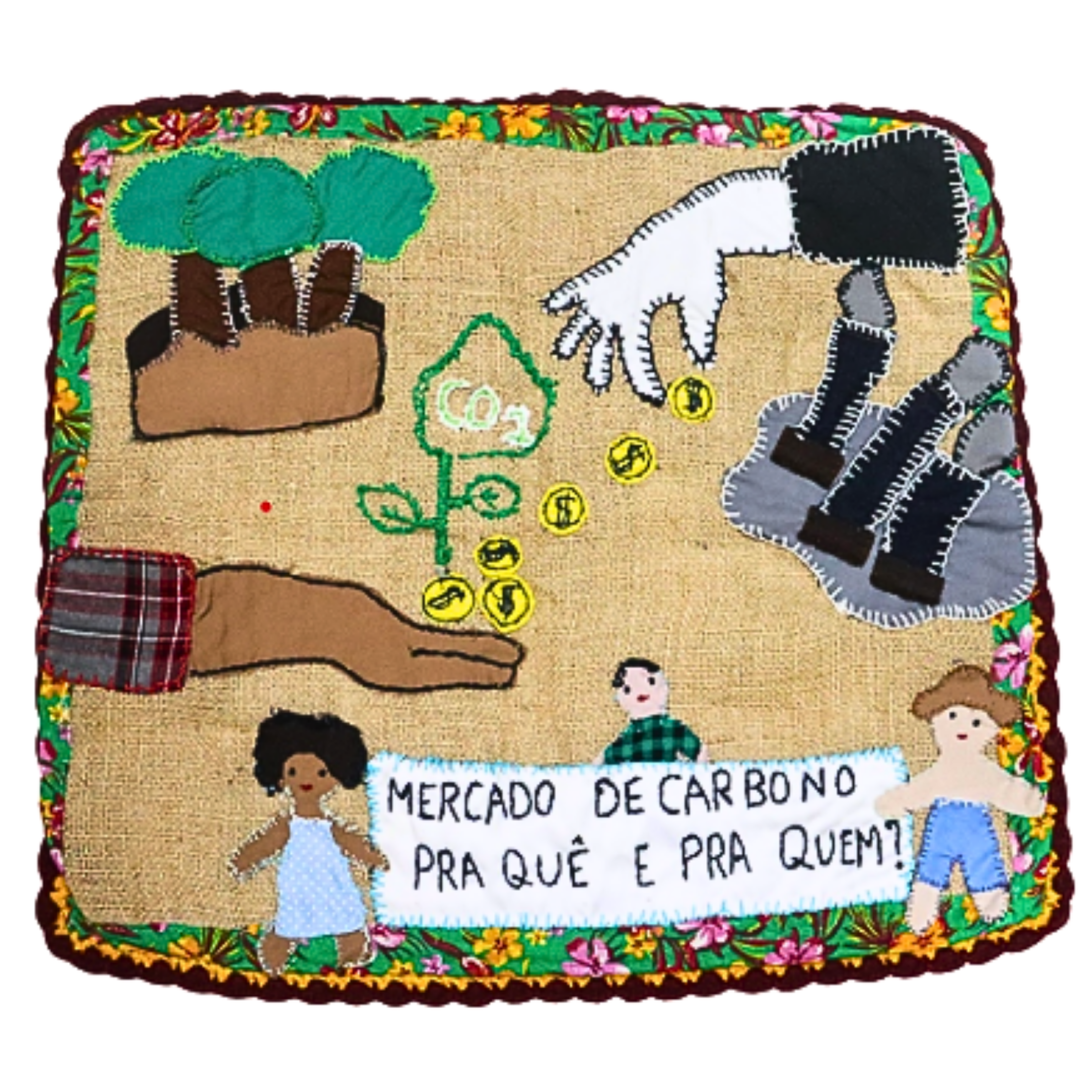 Essa arpillera mostra o avanço da propaganda da falsa solução sobre a crise climática apresentada pelas empresas com o mercado de carbono. Essas falsas soluções propagandeadas é mais uma forma de enganar os pequenos agricultores, com a justificativa de proteção a floresta, na tentativa de negociar as terras das populações trocando dinheiro pelas florestas. Esse é um assunto que mais uma vez confunde a cabeça e levanta questionamento no meio social, afinal, a população busca saber: “mercado de carbono pra quê e pra quem?”, tentando alerta que isso é uma falsa solução para a crise climática pois, as empresas continuarão emitindo gases poluentes e usando as populações como camuflagem dos seus crimes ambientais.