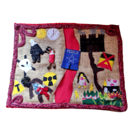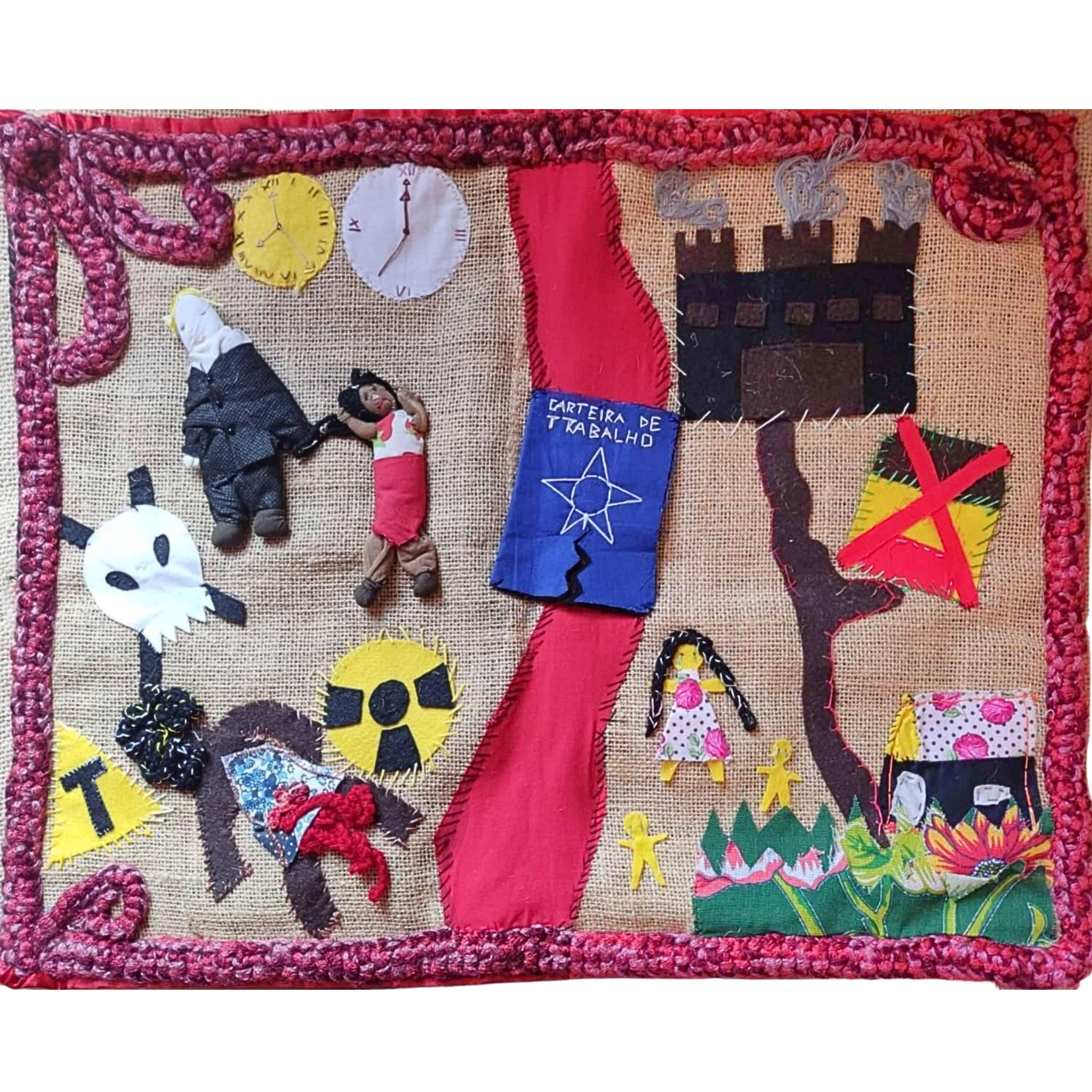 Nesta arpillera juntamos vários elementos do debate sobre a reforma trabalhista do governo golpista Michel Temer. A reforma trabalhista traz várias consequências negativas na vida das trabalhadoras e trabalhadores e, principalmente, na vida das mulheres do campo e da cidade. Temos uma jornada de trabalho triplo no cuidado com a família, os filhos e ainda sofremos com os vários tipos de violência, seja, no trabalho, em casa ou na rua. Com a nova reforma trabalhista, as mulheres irão trabalhar em locais insalubres, mesmo estando gestantes e estes locais apresentarem risco a vida de seu bebê podendo até abortar. Também a nova lei aumentará a jornada de trabalho, as mulheres não terão mais proteção perante os assédios sexuais no trabalho. Muitas creches serão fechadas e não teremos mais locais para deixar os filhos em segurança. Nossas carteiras de trabalho e todos os direitos trabalhistas foram totalmente rasgados.
