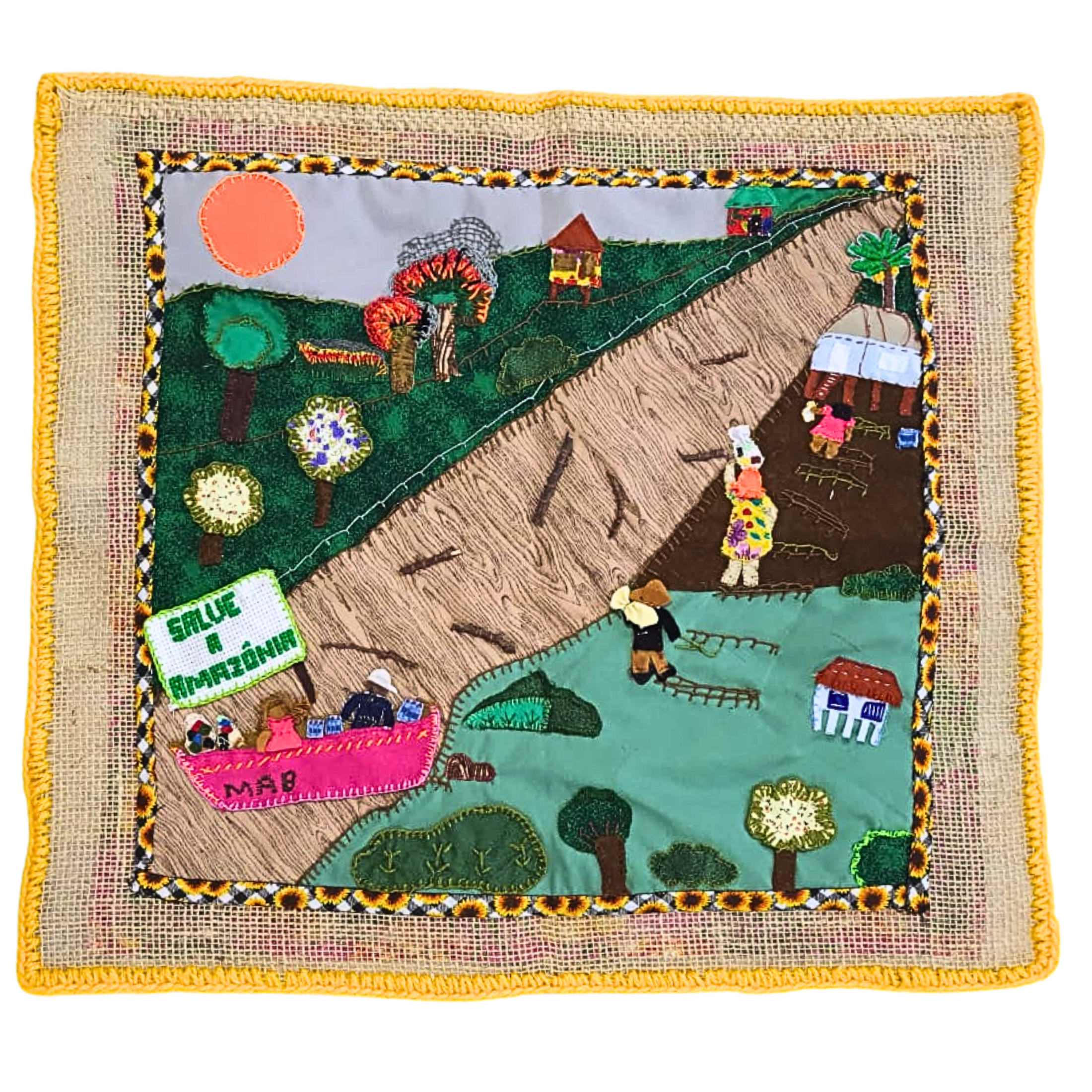 Em tons terrosos e vibrantes, a arpillera retrata um cenário árido e rachado às margens do Rio Madeira, denunciando o impacto da crise climática nas regiões ribeirinhas de Rondônia. Os tecidos costurados à mão mostram casas simples com árvores queimadas e fumaça, cercadas por vegetação seca e céu sem nuvens. No centro, mulheres e homens do Movimento dos Atingidos por Barragens (MAB) aparecem distribuindo cestas básicas e galões de água potável, em gestos de esperança e solidariedade entres os períodos de 2024 e 2025 foram distribuídos 90 mil litros de água totalizando 2.500 fardos de 2l e mais 6.500 cestas de alimentos. Bandeiras do MAB tremulam entre os fios carregando o nome do projeto salve a Amazônia, simbolizando união e resistência popular frente ao abandono institucional. Cada ponto e remendo da arpillera ecoa a força das comunidades que, mesmo no período de seca extrema, encontram no coletivo a sua maior fonte de sobrevivência.