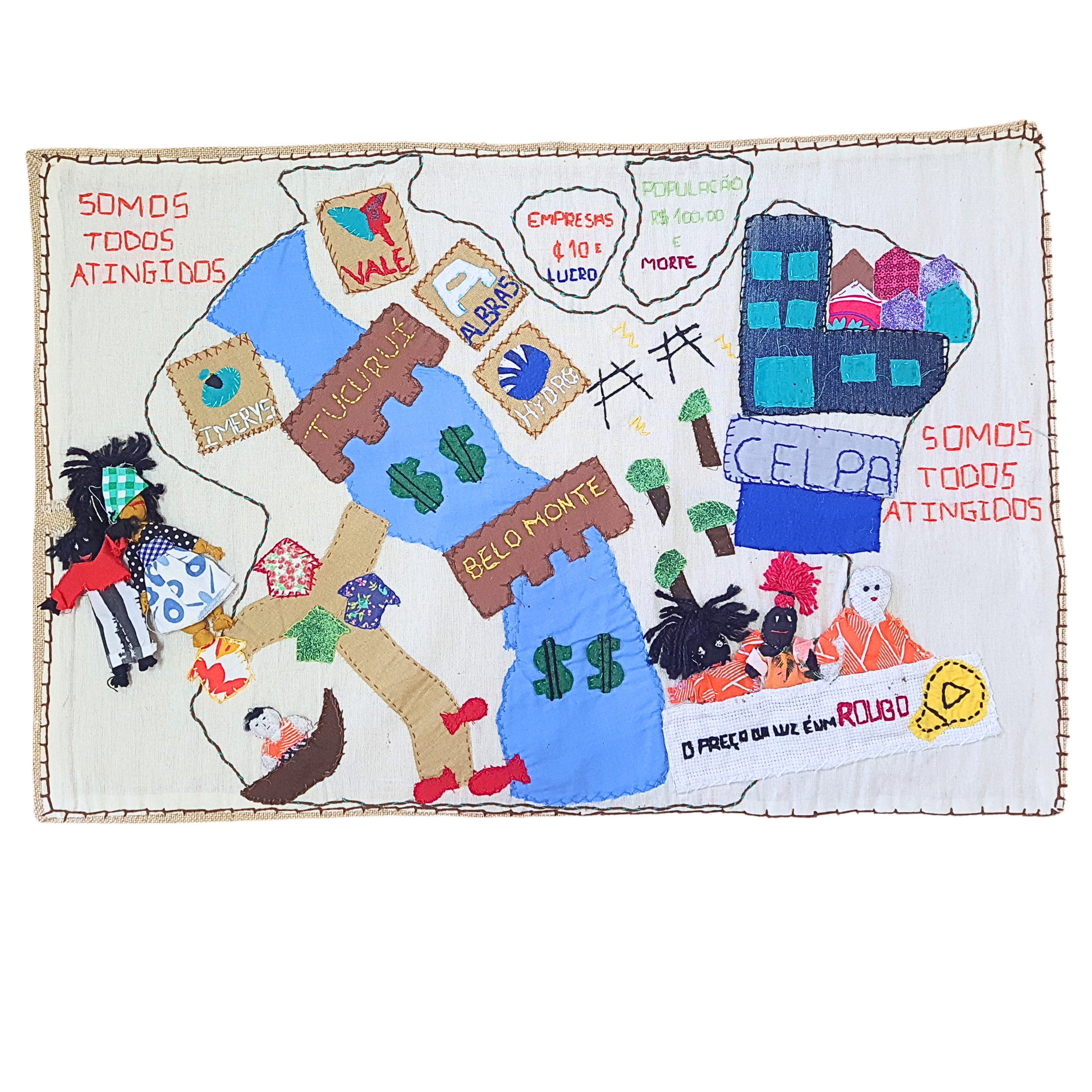 Como plano de fundo temos bordado o mapa do Pará e no centro dele um rio, que representa os rios do estado que são barrados pelas hidrelétricas de Tucuruí e Belo Monte. Ao redor dessas barragens, representamos algumas empresas como a Vale, Hidro, Albras, Imerys e Celpa, que utilizam a energia produzida pelos rios para gerar lucro, enquanto matam nossos rios e a nossa gente.