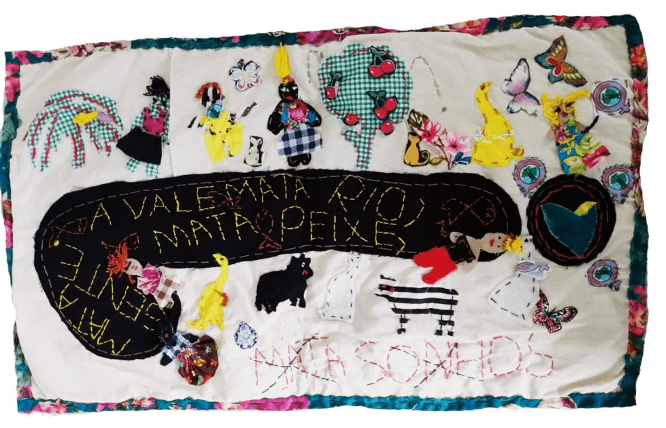 Esta Arpillera retrata o rio doente de cor preta com afirmações de que “a Vale mata rio, mata peixes, mata gente e mata sonhos”. O Paraopeba é responsável pelo abastecimento de água de oito municípios atingidos. Destes, seis estão na região metropolitana de Belo Horizonte. (Brumadinho, Betim, São Joaquim de Bicas, Juatuba, Esmeraldas, Mário Campos e Igarapé). Inviável para abastecimento humano, irrigação, pesca e lazer. Desde o rompimento, a venda de peixes, bem como o turismo de pesca, importantes fontes de renda dos municípios não existem mais.