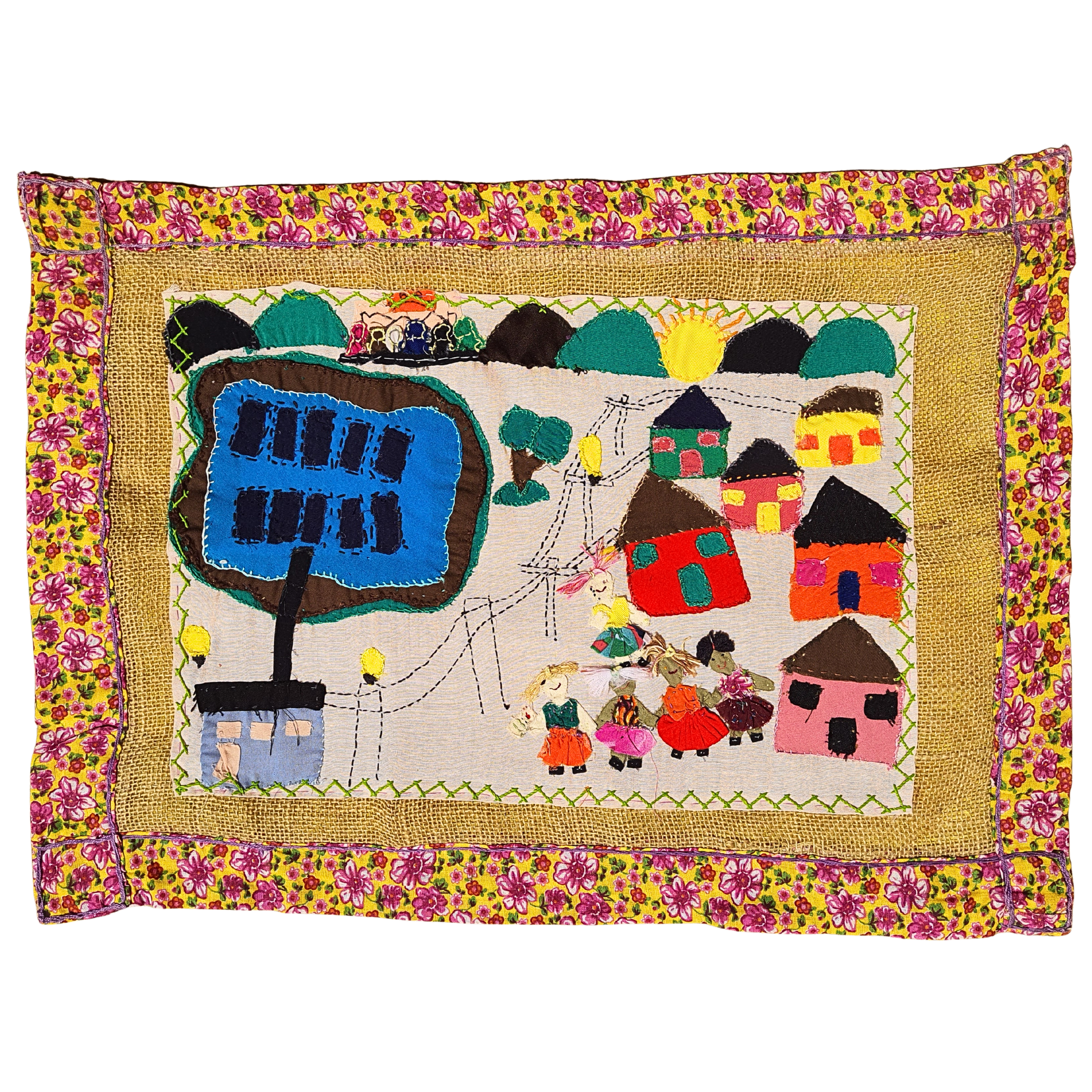 Essa Arpillera, produzida pelas mulheres atingidas de Jequitinhonha e Rio Pardo, retrata o projeto que representa uma conquista histórica: a construção da maior usina fotovoltaica flutuante da América Latina, instalada em Grão Mogol, no semiárido mineiro. Idealizada pelo MAB e viabilizada por um Projeto de Pesquisa e Desenvolvimento (P&D) da Aneel, a usina integra o Plano de Recuperação e Desenvolvimento de áreas atingidas por barragens no Vale do Jequitinhonha. Hoje, ela vai reduzir os custos das contas de luz de aproximadamente 1.250 famílias, que também serão responsáveis pela gestão, através de uma associação formada pelas próprias comunidades.