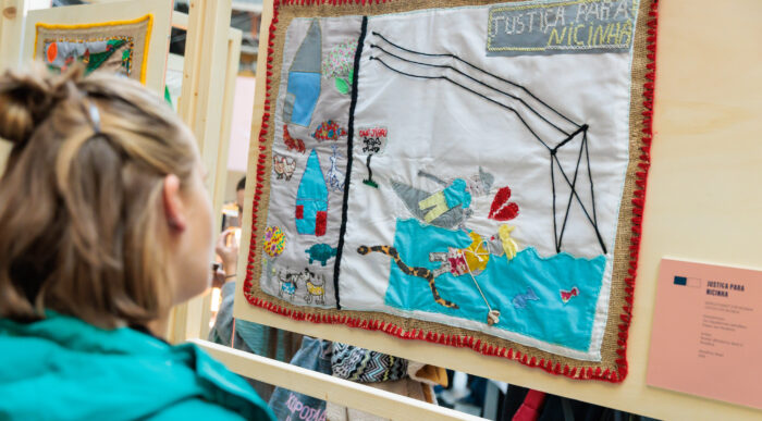 Na Áustria, arpillera que pede justiça por Nicinha integra a exposição itinerante que denuncia a situação das populações atingidas por barragens e por eventos climáticos extremos no Brasil